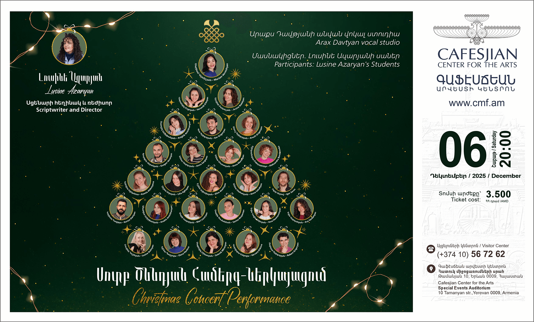 MUSIC CASCADE - Christmas Concert PerformanceDecember 06, 2025 “Music Cascade” concert series presents:Christmas Concert Performance Arax Davtyan vocal studio Participants: Lusine Azaryan's Students Participants: Լilia Aghayan Varsenik Erkoyan Lusine Dolinyan Anna Sargsyan Anna Muradyan Yeva Vardanyan Arsine Badalyan Satenik Minasyan Ksenia Alekseyeva Mari Lazaryan Anush Grigoryan Anna Sahakyan Sarine Koujanian Anahit Amirkhanyan Astghik Amirkhanyan Gurgen Veranyan Mariam Vermishyan Eline Avetisyan Igor Serov Aleksandra Bondarenko Yeva Hovhannisyan Varvara Enkova Elena Pavlova Gor Grigoryan Robert Grigoryan Koryun Davtyan The concert starts at 20:00 Ticket price: 3.500 AMD For reservations and inquiries, please call +374 10 567262. Only CCA Members can reserve a table through a phone call. Please remember we have a special reservation service –you can SELECT YOUR FAVORITE TABLE at the Special Events Auditorium! Just stop by the Visitor Center to select the table you prefer as you buy tickets. We shall make sure your favorite table is reserved for you! Become a member of the Cafesjian Center for the Arts and receive a 10% discount on tickets to all concerts, events, and merchandise in the Museum Store. Other materials from this section